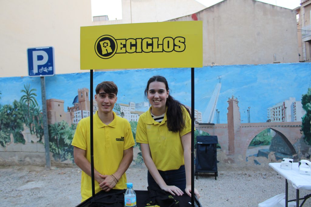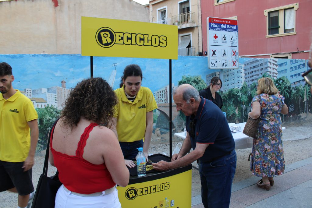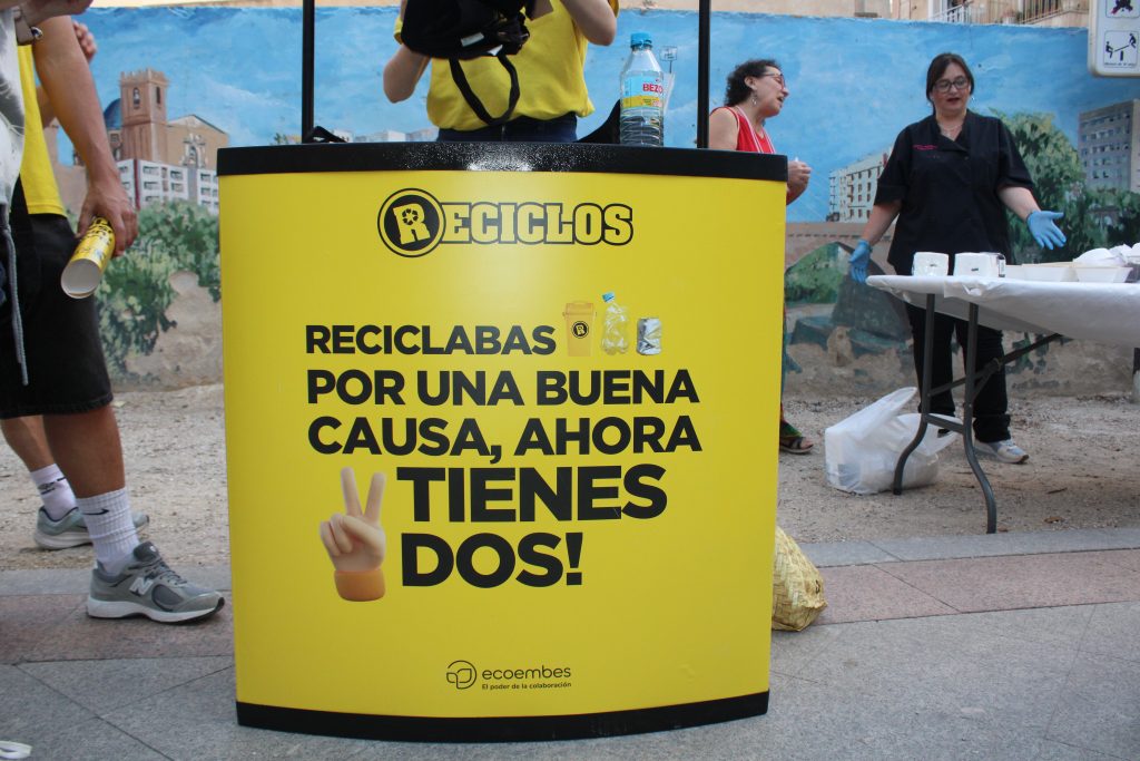 Muy importante es el tema del reciclaje y la limpieza siendo respetuoso con el medio ambiente durante las fiestas. Ecoembes es una empresa que a través de cualquier evento incentiva a la gente, además de colegios e institutos, a reciclar y que cada vez lo hagan más personas que antes el hecho de separar residuos les resultaba más díficil por tener los conocimientos mínimos. Dicho incentivo es una aplicación para móvil llamada Reciclos para gente de todas las edades que tengan dispositivos. Con esa APP se escanea un producto, se indica el tipo de contenedor, se obtienen puntos y se canjean por regalos. La foto más destacada es la de las Delicias de Elche que se conseguían como premio al descargarse la APP y arriba se pueden visualizar una serie de entrevistas sobre la empresa y la aplicación con una breve explicación de su funcionamiento. Y en el vídeo de abajo se explica de forma general el producto típico de Elche que es el dátil con Denominación de Origen.