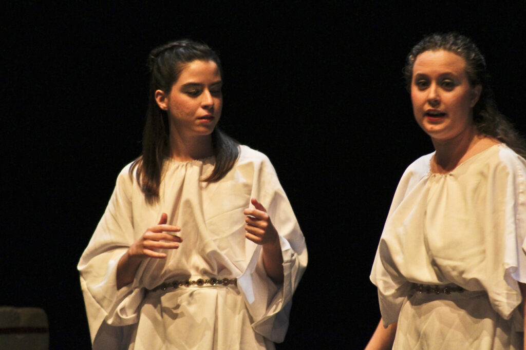El teatro amateur, llamado Mostra de Teatre Dama d’Elx se ha celebrado del 10 al 28 de septiembre con diferentes espectáculos en el interior del Gran Teatro de Elche. En este caso, la obra «Nada es imposible en el amor» vista el día 14 de septiembre de 2024 representa la vida de los Dioses quienes buscan entretenimiento en el amor para saciar el aburrimiento en el Olimpo. Vulcano, uno de ellos, se le ve desesperado por encontrar pareja obliga a Jupiter a casarle con Venus y esta acepta con desgana. Sin embargo, durante la celebración de la boda, un regalo envenenado aparece en escena y en una de estas fotografías de la publicación. Los actores y actrices pertenecen a Pobladors d’Elx.